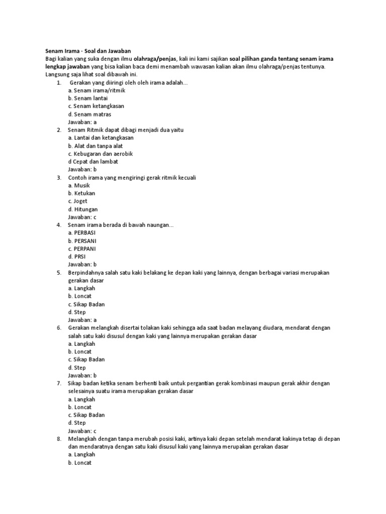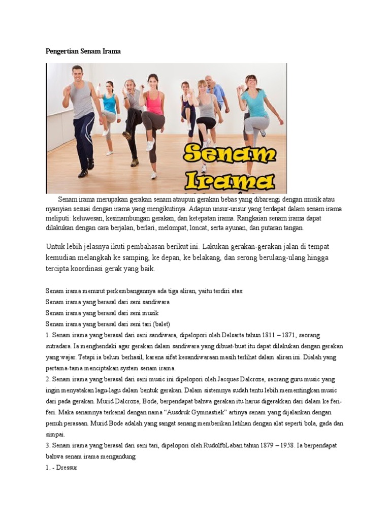 Soal Senam Irama.docx (Anthony Logan) Jawaban: Inilah kegunaan musik yang bisa menyempurnakan dan membentuk keharmonisan dalam senam irama. Senam irama atau sering disebut dengan senam ritmik, merupakan salah satu cabang olahraga artistik yaitu seseorang memperlihatkan gerakan senam yang dilakukan dalam irama musik dengan menyatukan akrobatik, tari modern dan balet. Senam irama adalah senam yang dipertandingkan dalam suatu olimpiade dan juga senam irama internasional.